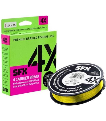 Sufix SFX 4X Braid Hot Yellow sene, multifilament - 275 meter. Sufix SFX 4X er en multifilament fiskeline laget av 100% japanske UHMPE fibre. Dette gir linen en glatt overflate som igjen gir deg lange kast takket være lite friksjon i stangringene når linen fyker ut. Høy knutestyrke kombinert med lite strekk gir deg sikker kroking, og styrken gjør at du hamler opp med det meste i norske farvann. Linen er flettet av fire fiberbunter. Anbefalt knute: Palomarknute, fireline-knute. Spesifikasjoner Spole: 275 meter. Farge: Hot Yellow. Bruddstyrke: 0,128 mm - 5,5 kg. 0,165 mm - 8,6 kg. 0,205 mm - 11,5 kg. 0,235 mm - 13,6 kg. 0,285 mm - 18,0 kg. Multifilamentsene Multifilamentsene, braid og flettet sene er navn på denne type sene. Denne type sene har ingen strekk og du vil kjenne det minste napp, sena har svørt høy bruddstyrke i forhold til senetykkelse. På grunn av tykkelsen får du også ofte plass til mye sene på spolen sammenlignet med tilsvarende monosene. Mange skjøter på en fortom av mono eller fluorcarbon for tilføre litt strekk og redusere synlighet og slitestyrke i enden av snøret. Tips: Bruk alltid fortom! Under fiske med multifilament sene og Fused line bør sjokkfortom alltid brukes da dette gir mindre synlighet frem mot pilk, sluk, spinner og wobbler. Med sjokkfortom oppnår du i tillegg litt strekk når fisken raser avgårde. En fortom tåler også mer direkte kontakt mot skarpe fisketenner og bunn enn multifilament sene og fused line. ...