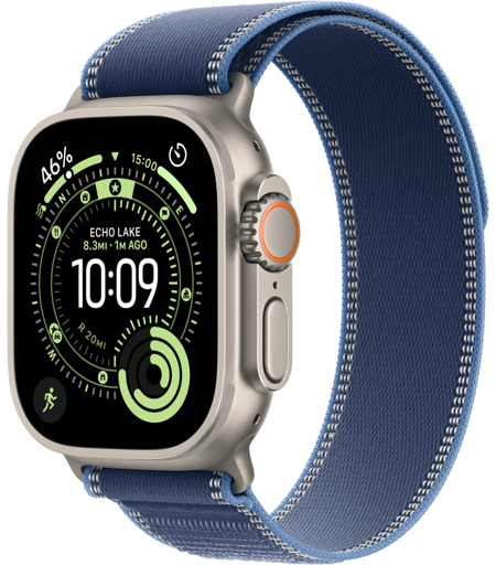 Apple Watch Ultra 3 gir deg urkrefter i sving. Ultra 3 har den beste GPS-en du får i en sportsklokke og den lengste batteritiden i en Apple Watch til nå. Den store og avanserte skjermen gir mer lys fra siden for full oversikt med et raskt blikk. Og helsefunksjonene er banebrytende – Watch Ultra 3 kan blant annet registrere tegn på forhøyet blodtrykk, gi innblikk i søvnkvaliteten din og spore syklusen din. Urkasse på 49mm i fargen naturlig titan og Trail Loop i størrelse S/M i fargen blå/klarblå. Passer til håndledd på 130-180mm. Tilkobling: GPS + Cellular. Ring og send meldinger rett på din Apple Watch. ...