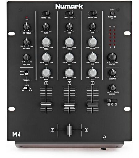 Numark M4 er en tre-kanals profesjonell mikser designet for enhver DJ som trenger maksimal fleksibilitet. Den har en utskiftbar crossfader med revers og hellingskontroller en mikrofoninngang med EQ og rikelig med ruting for phono og line level-enheter. Også med seks trinns LED-nivåindikatorer kan M4 overvåke både master- og PFL-signalstyrken for å sikre at det ikke er noen klipping eller distortion. Med en 3-bånds eq på hver kanal kanalcueing og sterke og glatte faders er M4 ekstremt allsidig og robust 3-kanals mikser. ...
