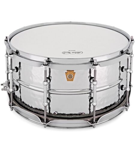 Ludwig LM402KT 14'' x 65'' Hammered Supraphonic Skarptromme er en lekker snare i aluminium i kromfinish - en klassisk Ludwig. Det hamrede aluminiumsskallet gir en lys resonant tone med en flott balanse mellom pop og crack noe som gjør snare ideell for et bredt spekter av trommestiler og sjangere. Den høykvalitets krom- hardware inkluderer trippelflensede bøyler akkompagnert av Ludwig-rørklammer og tilbyr konsekvent og pålitelig tuning og tydelige sidestikker. snare tilgjengelige med rør- eller imperiale ører og enten sømløse eller hamrede skall og leverer ytelse på profesjonelt nivå til en svært konkurransedyktig pris. ...