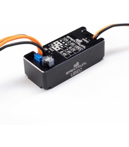 product detailsthese days, many radio control applications require multiple high-power, high-torque servos that can draw a lot of current. the spektrum™ ubec efficiently delivers power from the battery to the servos. in the box (1) 10a 2-6s ubec (1) manual spektrum 10a 2-6s ubec overview the ubec uses an efficient dc-dc regulator chip with a conversion efficiency of more than 90%. the ubec output voltage is adjustable in three stages (6.0/7.4/8.4 v) with a continuous current of 10a and a maximum of 15a. the voltage specifications allow the use of a wide range of servos and electrical equipment such as lights, winches, wipers, and more. the aluminum housing is designed to help dissipate heat and reduce electromagnetic interference. additionally, the ubec is equipped with overcurrent protection, output short-circuits protection, overheat protection, and ip67 waterproof dust design, and can be used with crawlers, trucks, aircraft, and other electric models. spektrum 10a 2-6s ubec features high-efficiency dc-dc regulator chip for transfer efficiency of over 90% adjustable output voltage (6.0v/7.4v/8.4v) applicable for devices with different voltages handles 10 amps continuous current, 15 amps instantaneous current multiple protections, including overcurrent, short circuit, overheat, and ip67 waterproof dust design aluminum housing for quick heat dissipation and less electromagnetic interference ...