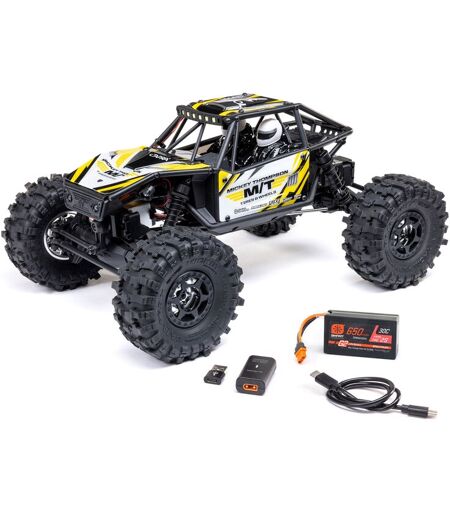 axial 1/18 utb18 capra rc trail buggy rtr overview the axial utb18 capra 4ws unlimited trail buggy climbs to the summit of the mini rc crawler category with the best features for crawling on challenging indoor and outdoor trails. it's also fully ready-to-run, and at 1/18 scale, very affordable. whether you're a veteran rc crawling enthusiast or a new modeler bringing home your first rc rig, the utb18 capra 4ws makes it easy to add adventure to your life almost anywhere. no previous 1/18 scale rtr mini crawler has offered this level of performance and value. four-wheel steering gives the utb18 capra 4ws impressive maneuverability, whether you're climbing rock ledges, flexing over obstacles, or squeezing through tight notches. portal axles with currie f9 housings provide the high clearance to navigate those rougher, tougher trails. officially licensed mickey thompson baja pro x tires mounted to pro-line holcomb crawler bead-loc wheels supply the grip to get through extreme terrain. the rig's 4-link suspension geometry provides smooth, consistent articulation without the bump steer found in 3-link designs. for increased performance and durability, the lower links are made of stainless steel. add in the quick, strong steering of its axle-mounted, 1/10 scale servo, and the utb18 capra 4ws is ready to conquer challenges indoors and out – and even outperform some larger rock crawlers. then there's the utb18 capra 4ws 4-wheel steering system. it's never been easier to tightly follow the line that leads from “here” to “there”. three steering modes – for no rear tire input, mirrored rear tire input, or “crab crawl” – can be activated from the included 3-channel spektrum slt3 2.4ghz transmitter. these modes provide the flexibility you need to maneuver over or around almost anything in your way. all drivers gain new terrain conquering ability! the scaled-down capra tube chassis adds realistic trail buggy looks, with helmeted driver and passenger figures, led headlights, rock lights, and light bar. choose from two new paint scheme and livery options. one has a gray cage and blue body panels with licensed king shocks livery. the other has a black cage and yellow body panels with licensed mickey thompson tire livery. the utb18 capra 4ws ready-to-run package includes high-quality spektrum electronics for maximum value. the stand-alone spektrum firma 25a brushed esc and spektrum 5-channel sr515 dual protocol receiver accommodate additional lighting options and transmitter upgrades. the spektrum smart 650mah 2s lipo battery powers the rig through 30+ minutes of uninterrupted adventure. recharge the battery quickly and easily with the supplied spektrum smart usb-c charger. whether you're looking for an inexpensive entry into rc crawling or want to add a mini to your collection of axial rigs, prepare to be won over by the features, capabilities, looks, and value of the utb18 capra 4ws/4wd unlimited trail buggy. plus, many axial utb18 option parts are already... ...