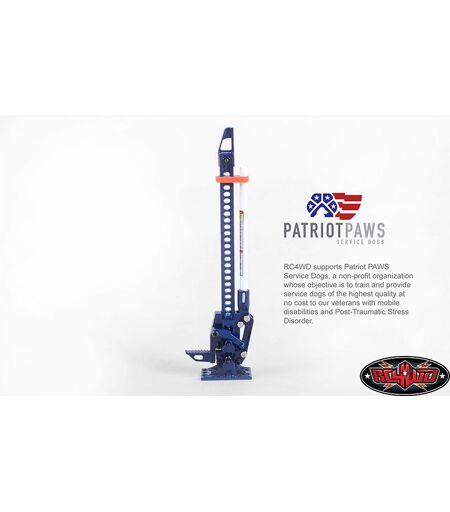 rc4wd 1/10 hi-lift® patriot edition jack the one and only hi-lift® patriot edition jack is now offered in 1/10 scale size. it is fully functional down to the smallest details. there are imitators, but no one lives up to the one and only hi-lift. these have been officially licensed by the hi-lift jack company and are only available from rc4wd and our dealers. rc4wd supports patriot paws service dogs, a non-profit organization whose objective is to train and provide service dogs of the highest quality at no cost to our veterans with mobile disabilities and post-traumatic stress disorder. rc4wd will donate a portion of the proceeds from every 1/10 hi-lift® patriot edition jack sold. specifications: zinc alloy body patriot edition blue powder coated finish white powder coated two piece handle and socket red handle-keeper included total height: 5.35in / 135.8mm total width: 1.45in / 36.8mm base plate width: 1.10in / 28.0mm base plate length: 0.63in / 16.0mm handle length: 2.95in / 75.0mm handle od: 0.16in ...
