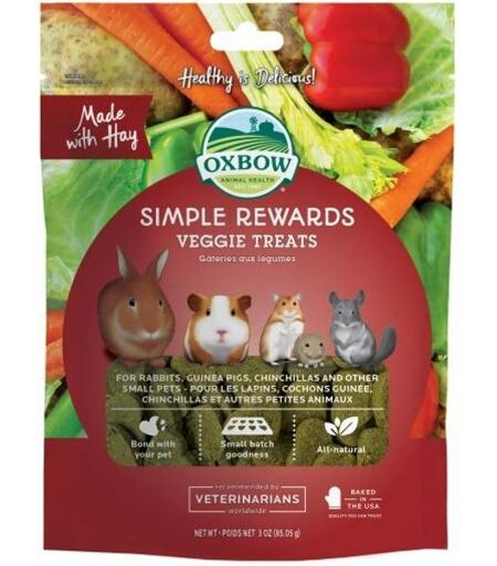 Veggie Treats 85 gOxbow Timothy Treats are a wholesome, healthy treat favorite of rabbits, guinea pigs, chinchillas and other small pets. Made with fiber-rich timothy grass hay, Timothy Treats offer the fresh Timothy flavor and aroma animals love. Use Timothy Treats to add variety and enrichment to your pet’s diet. Simple Rewards Timothy Treats allow you to give your animal a healthy, delicious treat you can both feel good about.Sizes: 85gProduct Highlights:Made with 100% Timothy hayNo artificial colors or added sugarGreat source of enrichmentHelps support pet/pet owner bondFeed up to 2 pieces per day.Treats should not exeed 2% of your pet`s daily food intake. ...