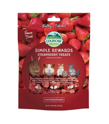 STRAWBERRY TREATS Why mess with nature’s perfection? Oxbow’s Simple Rewards Strawberry Treats consist of only 100% strawberries, harvested and freeze-dried at the peak of ripeness to ensure the freshest, best-tasting treat for your special pet. Rabbits, guinea pigs, chinchillas, and other small animals love these tasty treats, and you’ll love the feeling of providing a reward that contains no additives, preservatives, or added sugar. Simple Rewards Strawberry Treats are a natural source of vitamin C and contain natural antioxidants. Use Oxbow’s all-natural Strawberry Treats to add variety and enrichment to your pet’s diet.Size: 15gProduct Highlights:100% strawberries - no added sugarNo additives or preservativesGreat source of enrichmentHelps support pet/pet owner bond ...