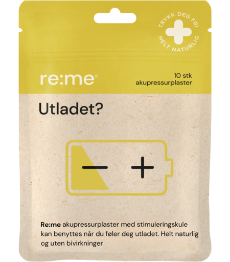 Re:me Utladet Akupressurplaster er akupressurplaster som kan benyttes når du føler deg utladet. Re:me Utladet Akupressurplaster består av en ergonomisk og elastisk nylontape med en stimuleringskule som er designet for å gi konstant akupressur. Akupressurplastrene påføres mot akupunkturpunktet ST36 under kneet på høyre ben og SP6 på innsiden av venstre ben. Ved å massere/klemme på kulen stimuleres akupunkturpunktene. Dette kan bidra til å naturlig frigjøre kroppens stagnerte energi. Plasteret er hudvennlig og har ingen bivirkninger. Plasteret har en varighet på opptil 72 timer og tåler vann. Fri for lateks. ...