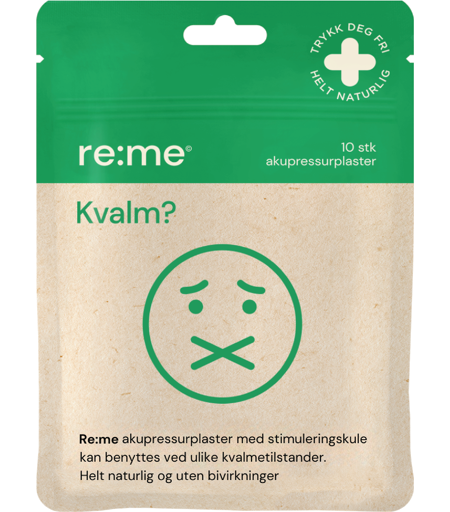 Re:me Kvalm Akupressurplaster er akupressurplaster som bidrar til å lindre ulike kvalmetilstander som graviditetskvalme og reisesyke. Re:me Kvalm Akupressurplaster består av en ergonomisk og elastisk nylontape med en stimuleringskule som er designet for å gi konstant akupressur. Akupressurplasteret kan brukes både forebyggende eller etter at kvalmen har oppstått. Plasteret påføres ved akupunkturpunktet PC6 på begge armer (ved håndleddene). Ved å massere eller trykke på kulen bidrar du til å stimulere punktene, som videre kan sette i gang kroppens naturlige evne til å lindre kvalme. Plasteret er hudvennlig og har ingen bivirkninger. Plasteret har en varighet på opptil 72 timer og tåler vann. Uten lateks. ...