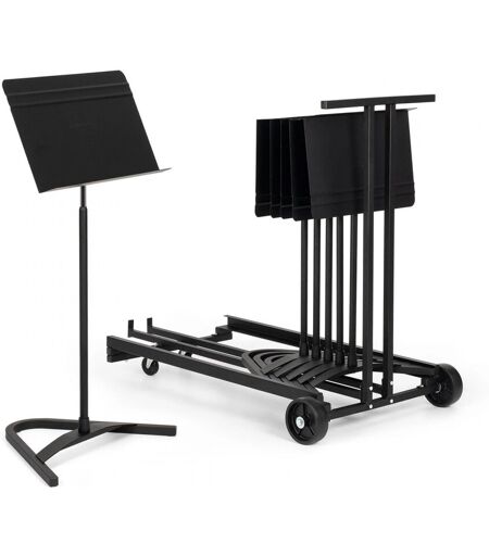 Manhasset Harmony-stativvognen er en solid vogn som kan inneholde opptil 15 Manhasset Harmony-notestativ. Takket være Harmony-stativets smarte design kan alle disse 15 notestativene få plass på bare fem fots plass slik at du kan oppbevare vognen i små skapplasser eller passe vognen i en heis i større lokaler. Akkurat som alle Manhasset-produkter er Harmony-stativvognen bygget for å vare. Med en sveiset stålkonstruksjon vet du at standvognen kommer til å holde tritt med det daglige musikalske regimet ditt. Den er til og med pulverlakkert for et elegant utseende og ekstra slitesterk finish. Vennligst merk: Notestativ er ikke inkludert. Denne vognen krever også montering alle fester er inkludert men du trenger 10mm/13mm/19mm skrunøkler og flathode- og stjerneskrutrekkere. ...