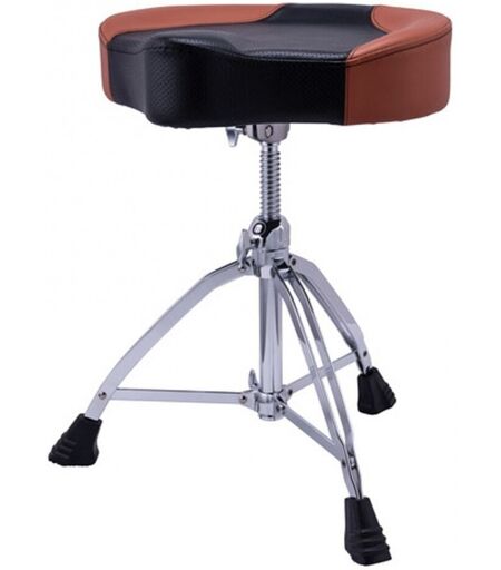 Mapex T855BR Saddle-Style Breathable Drum Throne Brown Leatherette er et must for trommeslagere som ønsker pålitelig støtte og komfort. Med sitt 17" x 4" tykke polstrede sete i sadelstil sørger denne trommestolen for at du kan spille i timevis uten ubehag eller tretthet. T855BR er både stilig og praktisk og har en topp i pustende tøy med brunt kunstskinn. Det perforerte stoffet lar luften sirkulere og holder deg avkjølt under intense trommeøkter. Det ultrasikre klemmefestet sørger for stabilitet slik at du kan fokusere på å spille uten bekymringer. Det er enkelt å justere høyden på trommestolen med den 19" til 25" gjengede stålspindelhøydejusteringen og spindellåsen. Det betyr at du enkelt kan finne den perfekte spilleposisjonen. De dobbeltforsterkede stativbeina gir eksepsjonell stabilitet slik at du trygt kan spille trommer med maksimal støtte. Med sklisikre føtter og slitesterke stålben har Mapex T855BR Saddle-Style Breathable Drum Throne alt du trenger for en komfortabel trommekarriere. ...
