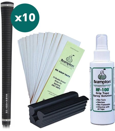 Komplett grepskift pakke med alt du trenger til å skifte grep på 10 stk. golfkøller. Pakken inkluderer 10 stk. Straight-On Tour Velvet golfgrep og Brampton sin populære grepskift pakke som inneholder 15 stk dobbeltsidig tape i rett lengde, væske i sprayflaske, klemme for å holde køllen fast og instruksjoner for skifte av grep. ...
