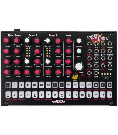 Cre8audio Boom Chick Desktop Drum Machine er et kraftverk av analog trommesyntese og intuitiv sequencing utviklet i samarbeid med Pittsburgh Modular. Boom Chick er bygget fra grunnen av for å levere taktil rå perkusjonskraft og blander håndlagde analoge kretser med en performance-klar sequencer som belønner utforskning og umiddelbarhet. Boom Chick er designet for elektroniske musikere produsenter og beatmakere som ønsker en slagkraftig analog tone med dyp rytmisk kontroll og har fem fyldige trommestemmer (kick snare hats og to multifunksjonelle kanaler) som alle styres av et strømlinjeformet grensesnitt med knotter per funksjon. Sequenceren tilbyr trinnvis redigering eller live fremføringsmodus med polyrytme swing sjanse og generative rytmeverktøy for endeløse grooves. Om du lager komplekse spor i studio eller skaper kaos på scene er Boom Chick bygget for seriøs beatskaping uten menydykking eller friksjon i arbeidsflyten. ...