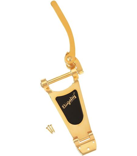 Licenced Bigsby B60 er en gullfarget vibrato designet for større archtop-gitarer. Den er basert på den originale B6-designen og gir jevne pitch bends med en mykere strengeføling takket være en konstruksjon uten strekkstag noe som gjør den ideell for ekspressive spillestiler. Den støpte aluminiumsrammen og håndtaket i rustfritt stål gir solid ytelse med vintage karakter. B60 er enkel å montere og med alt monteringsutstyret som følger med gir den instrumentet ditt et klassisk preg av stil og lyd. ...