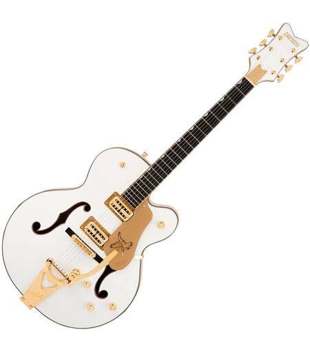 Gretsch Synchromatic Falcon er en fantastisk hollow body elektrisk gitar som blander tidløs stil med moderne ytelse. Den er lakkert i Snowcrest White med gold sparkle med binding og maskinvare og den fanger den umiskjennelige elegansen i Falcon-designet. Den 25" dype laminerte lønnekroppen og Semi-Arc-bracing gir en fyldig resonant tone med utmerket klarhet og kontroll. Utstyrt med Hi-Fidelity FilterTron-mikrofoner et glatt ebony gripebrett og en Bigsby B60 V-Cutout vibrato-stykkestykke tilbyr denne gitaren uttrykksfull lyd og uanstrengt spillbarhet. Førsteklasses detaljer som en mutter i ekte ben Adjusto-Matic bro med ebony base og Grover-stemmere gjør den til et prestasjonsklart instrument med ekte Gretsch karakter. ...