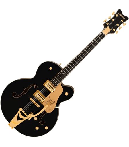 Gretsch Synchromatic Falcon er en fantastisk hollow body elektrisk gitar som blander tidløs stil med moderne ytelse. Med en elegant svart finish og gold sparkle og innbinding og maskinvare i svart fanger den den umiskjennelige elegansen i Falcon-designet. Den 25" dype laminerte lønnekroppen og Semi-Arc-bracing gir en fyldig resonant tone med utmerket klarhet og kontroll. Utstyrt med Hi-Fidelity FilterTron-mikrofoner et glatt ebony gripebrett og en Bigsby B60 V-Cutout vibrato-stykkestykke tilbyr denne gitaren uttrykksfull lyd og uanstrengt spillbarhet. Førsteklasses detaljer som en mutter i ekte ben Adjusto-Matic bro med ebony base og Grover-stemmere gjør den til et prestasjonsklart instrument med ekte Gretsch karakter. ...