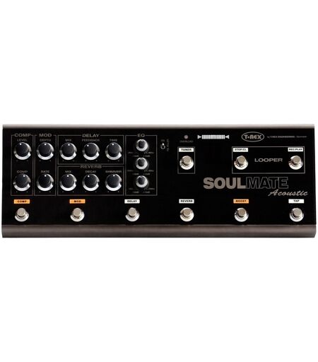 T-Rex Soulmate Acoustic Multi-FX Pedalboard er et ekteskap av kraftige effekter med allsidige tonejusteringsverktøy perfekt for å optimere lyden og levere en utrolig ytelse. Hver effekt på Soulmate Acoustic er designet for å øke styrke og utvide den akustiske lyden din ved å tilby modulasjons- komprimerings- delay reverb og boost-effekter. Et så bredt spekter av effekter lar deg omdefinere lyden til oppsettet ditt fullstendig. Pedalen er også utstyrt med en 3-bånds EQ for å tillate spillere å finjustere tonen sammen med en tilbakekoblingsbryter for å fjerne uønsket støy. En fem-minutters looper er også inkludert på T-Rex-enheten som lar deg ta spillet ditt til nye høyder og enkelt lage episke lydlandskap. Den har også en stereoutgang for å imøtekomme spillere som bruker flere forsterkere T-Rex Soulmate Acoustic Pedal er den perfekte følgesvenn for alle musikere som ønsker å forbedre ytelsen. ...