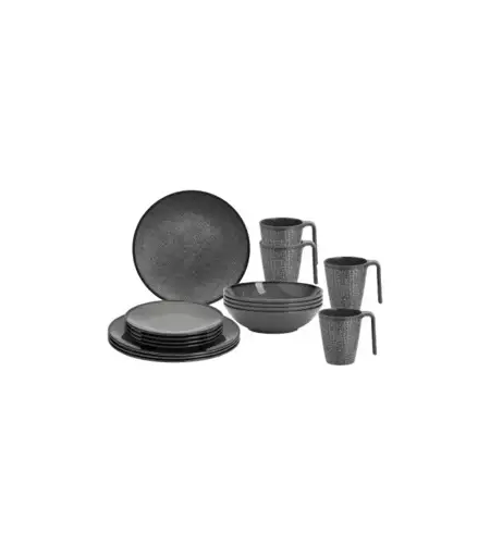 Lekkert middagsservise som ser ut, og føles som porselen, men er laget av melamin av høy kvalitet. Hard støtbestandig overflate, smak- og luktfri, kan fryses. Lett å rengjøre, og kan vaskes i oppvaskmaskin. Stabilt og motstandsdyktig mot knusing. Antiskli-ring. Består av følgende 16 deler: 4 stk dyp tallerken Ø21cm 4 stk asjett Ø20cm 4 stk middagstallerken Ø25cm 4 stk krus Hot Mug 30cl ...