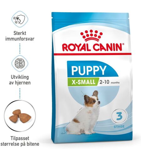 Egenskaper Valpefôret inneholder en eksklusiv kombinasjon av næringsstoffer som styrker immunforsvaret og forbedrer fordøyelsen med LIP-proteiner og prebiotika som gir en balansert mage- og tarmflora. Svært små raser er mer utsatt for forstoppelse. Et balansert fiberinnhold bedrer passasjen gjennom tarmen og bidrar til avføring med bedre konsistens. Fôret hjelper også med å redusere tannsteindannelse, takket være næringsstoffene som binder kalsium i spytt. Rasjonering Se detaljert rasjonering på pakken. Rasjoneringen til høyre brukes til å beregne forbruk ved abonnering på fôr Bruk Fôr for 2–10 måneder gamle valper med en voksenvekt på under 4 kg ...