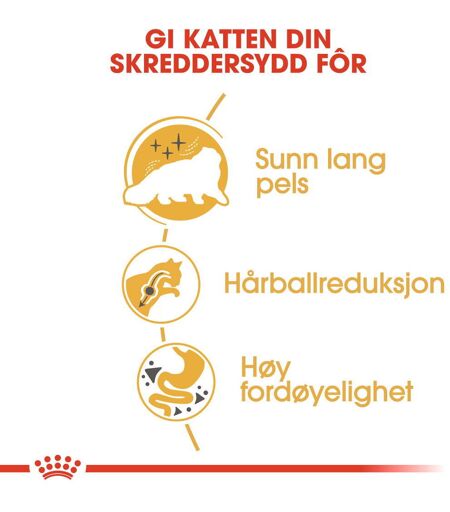 Royal Canin Persian – Tørrfôr for voksne perserkatter fra 1 års alder Hva er Royal Canin Persian, og hvem passer det for? Royal Canin Persian er et tørrfôr som ofte brukes til voksne perserkatter over 1 år. Produktet er spesielt utviklet for å støtte hudens barrierefunksjon og vedlikehold av pels hos langhårede katter – noe som gjør det populært blant eiere av perserkatter. Perserkatter har en unik kjeveform og bruker ofte undersiden av tungen for å fange opp fôret. Derfor har fôrbiten en spesiell utforming som er tilpasset denne spiseatferden. Fordeler med Royal Canin Persian: Rik på fettsyrer: Inneholder omega-3 (EPA & DHA) og omega-6 som ofte brukes for å støtte hudbarrieren og fremme glans i pelsen Hud og pels: Næringsprofil tilpasset langhårede katters behov Spesialformet fôrkule: Utformet for katter som bruker tungen til å hente opp fôret – som perserkatter ofte gjør Rasespesifikt fôr: Tilpasset perserkattens behov, inkludert lang pels og sensitiv hud Når brukes Royal Canin Persian? Fôret brukes ofte som daglig komplettfôr til voksne perserkatter fra 12 måneders alder. Det er spesielt nyttig for katter med tett, lang pels som kan ha behov for ekstra næringsstøtte til hud og pels. Royal Canin Persian er et av de mest valgte tørrfôrene for denne rasen – både på grunn av næringsprofilen og fôrbitenes spesielle utforming som passer perserkattens måte å spise på. ...
