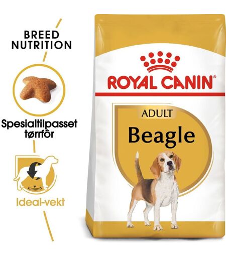 Egenskaper Beagler har ofte en svært god appetitt, noe som kan føre til overvekt. Dette fôrets sammensetning bidrar til å beholde hundens idealvekt, takket være et tilpasset kaloriinnhold. Fôrbitens størrelse, form og tekstur er tilpasset til beaglen, og fôrets spesifikke sammensetning bidrar til å styrke ben og ledd og opprettholde idealvekten. Beriket med EPA og DHA. Fôrbitens eksklusive form oppmuntrer hunden å tygge, og bidrar til at den spiser saktere. Sammensetningen inneholder også en kombinasjon av fibre som gir metthetsfølelse. Rasjonering Se detaljert rasjonering på pakken. Rasjoneringen til høyre brukes til å beregne forbruk ved abonnering på fôr.Bruk Fôr for beagler ...