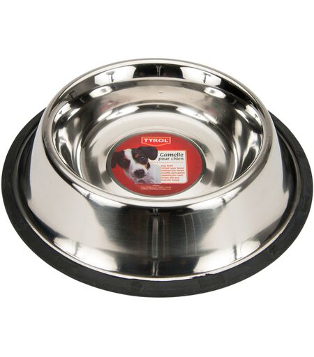 Rustfritt stål hundeskål fra Tyrol med gummikant for å hindre at den glir når hunden drikker eller spiser. Dimensjoner: 0,2 L 15 x 3 cm 0,9 L 20 x 6 cm 1,8 L 29 x 7 cm ...