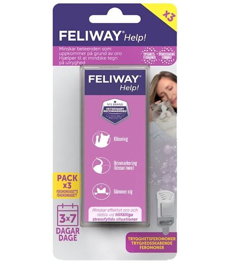 Feliway Help refill 3-pakning Refill-pakke til Feliway Help Duftspreder – reduserer midlertidig stress hos katter Feliway Help – Refillinneholder tre refill-pakninger til populære Feiliway Help duftspreder. Duftpakningene bør skiftes ut en gang i uken. Med Feliway Helps refill-pakning kan du og katten alltid føle dere trygge hjemme. Hvordan virker en duftspreder med feromoner for katter? Duftsprederen reduserer stress og uro hos katten din ved å utsondre trygghetsgivende feromoner. Feromoner har beroligende virkning på katter og reduserer stress. Plasser Feliway Help Duftspreder på kattens favorittplass i hjemmet. Koble den til en stikkontakt i veggen, så vil den dekke et område på 50 kvadratmeter. Har du en urolig katt? Feliway Help Duftspreder og Feliway Help refill sørger for å gi katten ekstra trygghet i midlertidig stressende situasjoner Legg merke til at effekten uteblir hvis duftsprederen plasseres bak en dør, gardin eller et møbel. Den bør være så åpent plassert som mulig. ...