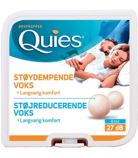 Quies Ørepropper Voks er ørepropper i voks som gir god støyreduksjon på 27 desibel. Quies Ørepropper Voks gir god støyreduksjon fra snorking, men er likevel i kontakt med omgivelsene og lar deg høre høye lyder som babygråt, alarmer og lignende. Øreproppene er enkle å forme og tilpasse til enhver ørekanal. Hver vokskule er omspunnet med bomull. Denne skal fjernes før bruk og er der for å rense fingrene som modellerer vokskulene til ønsket fasong. Øreproppene er allergitestet og inneholder ikke klorbleket bomull. Gir en lydreduksjon på 27 dB. ...