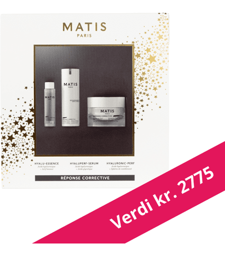 Julegavesett fra Matis - avansert pleie som korrigerer og revitaliserer i dybden. Verdi kr. 2775Produktene fungerer både på overflaten og i dybden av huden for å fylle ut og glatte ut rynker. Ansiktet blir avspent og trekkene bli mindre markert og selv de dypeste rynkene blir mindre skarpe.Produktene har en btx-lignende effekt og passer både kvinner og menn, som vil minimere eksisterende linjer og fylle ut huden. Gavekittet inneholder:Hyaluperf-Serum 30mlHyaluronic-Age 50mlHyalu-Essence 30ml ...