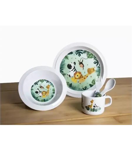 Mattrygt. Egnet for gutter og jenter. Nesten uknuselig. Med barneservisesettet SAFARI kan barna dine dykke inn i Afrikas dyreverden. Tallerkenene blir tømt for å se ape, sebra, giraffe & co. igjen. Ytterligere spesifikasjoner: Tallerken med høy kant: Ø 21 cm. Bolle: Ø 16 cm, volum 300 ml. Kopp: Ø 7,5 cm, H 6,2 cm, volum 250 ml. Merk (1/7): Temperaturangivelse: 70°C - maks. 2 timer. Merk (2/7): Ikke egnet for mikrobølgeovn. Merk (3/7): Tåler oppvaskmaskin i øvre kurv ved lav temperatur. Merk (4/7): Vennligst rengjør grundig med oppvaskmiddel før første bruk. Merk (5/7): La barn kun bruke produktet under tilsyn. Merk (6/7): Sjekk produktet for skader før bruk. Ikke bruk produktet hvis det er skadet. Merk (7/7): Egnet for barn fra 3 år. Innhold: 1 tallerken med høy kant, 1 bolle, 1 kopp, 1 gaffel og 1 skje. ...