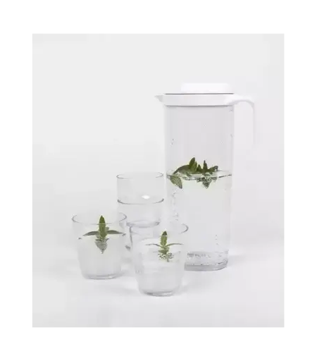 Glass kan oppbevares i kannen. Praktisk skrulokk. 5-delt sett bestående av en kanne med skrulokk, håndtak og helletut samt 4 stablebare glass. Glassene kan praktisk oppbevares i kannen. Ytterligere spesifikasjoner: Kannekapasitet: 1,5 l. Mål kanne: H 25 cm, Ø 11 cm. Glaskapasitet: 0,25 l. Mål glass: H 8 cm, Ø 7,5 cm. Innhold: 1 kanne, 4 glass. ...