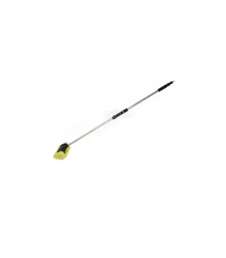 Sidebørster. Teleskopskaft 1,2 til 1,8m. Denne teleskopiske vaskebørsten har sidebørster som gjør det lettere å rengjøre hjørner. Børstebredden er ca. 26 cm. Aluminiumsstangen kan justeres trinnløst fra 120-180 cm. Børsten har en tilkobling for vannslange (Gardena-vannkoblingsventil), stengeventil og isolasjonshåndtak av svart skumgummi. Innhold: 1 vaskebørste, 1 teleskopskaft. ...