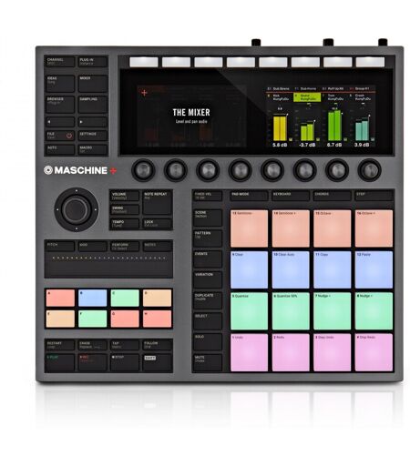 Den første frittstående Maschine groovebox. Native Instruments Maschine + er en kompakt og elegant produksjonsstasjon som bygger på suksessen til det originale Maschine-sortimentet. Dette nye og forbedrede designet lar deg bruke Maschine+ i frittstående eller kontrollermodus noe som betyr at du ikke trenger en datamaskin for å lage musikk. Maschine + beholder det samme kjente oppsettet som søsknene sine med 16 bakgrunnsbelyste hastighetsfølsomme pads som du kan bruke til fingertromming hugge prøver lage melodier og mer. De to skjermene lar deg enkelt navigere i innstillinger og lyder med innebygde kodere og knotter som gir deg grundig kontroll. I tillegg til det originale Maschine-biblioteket har Maschine + eksklusivt lydinnhold og instrumenter hentet fra Komplete-serien. Fra musikkproduksjon til live-opptredener kan Maschine + gjøre alt med funksjoner og kontroll designet for å optimalisere arbeidsflyten din og bringe ideene dine til liv. Maschine+ er drevet av en firekjerners prosessor og 4 GB RAM for rask og sømløs opprettelse. Den har også innebygd WiFi og Link-tilkobling for å installere nye produkter trådløst og samarbeide med andre artister. Fordyp deg i maskinverdenen. ...