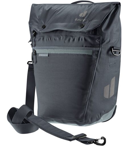 Mainhattan 17+10L fra Deuter er en sykkelveske som er like praktisk for handleturen som for jobbpendlingen. Denne allsidige vesken kan enkelt festes på sykkelens bagasjebrett eller bæres som en vanlig skulderveske. Med Mainhattan 17+10L får du en vanntett og fleksibel løsning for å transportere dine eiendeler. Det PFC-frie materialet beskytter innholdet mot regn og skitt. Deuters nyutviklede BagFix-system gjør det enkelt å feste og løsne vesken fra sykkelen med et raskt drag i håndtaket. En stor lokk med magnetspenner gjør det mulig å utvide volumet med ytterligere 10 liter. Vesken har en frontlomme, en glidelåsforsynt frontlomme og en uttrekkbar organiseringsenhet for nettbrett, dokumenter etc. med polstret laptoplomme (15”). BagFix hurtigfestsystem Avtakbar skulderrem Lokk med magnetspenner 10 L utvidbart volum Frontlomme Glidelåsforsynt frontlomme Uttrekkbar organiseringsenhet for nettbrett, dokumenter etc. med polstret laptoplomme (15”) Forsterkede kanter på bunnen Reflekser for bedre synlighet Innvendig lomme for verdisaker Vanntett IPX4 ...