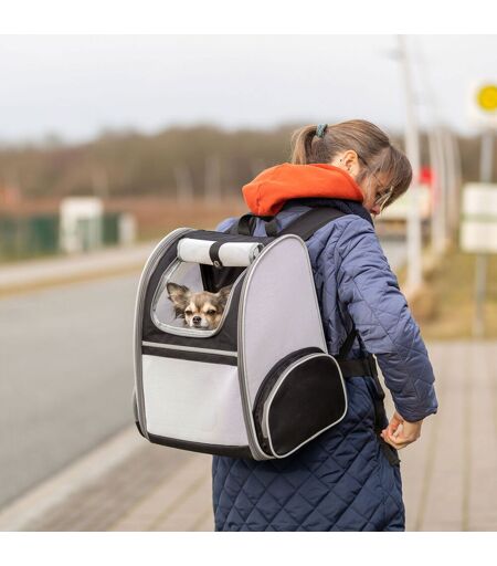 Trixie Hundeveske Ryggsekk Lysegrå Trixie Hundeveske Ryggsekk Lysegrå er en perfekt veske for å bære hunder på opptil 8 kg. Vesken er veldig behagelig å bære, der midjebeltet fordeler trykket på en optimal måte og brystbeltet bidrar til å holde vesken på plass. Trixie Hundeveske Ryggsekk Lysegrå har en luke med glidelås i toppen samt glidelåsutstyrte lommer på sidene til mindre tilbehør. Hele vesken er dekket med tett nettingmateriale, som gir god ventilasjon og gjør at kjæledyret ditt kan se ut. På innsiden sitter det en kort stropp for å feste i hundeselen. Mål: 39 x 43 x 27 cm. ...