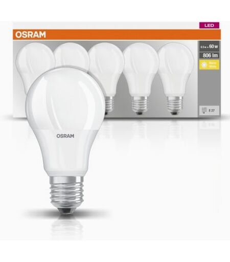 OSRAM BASE CLA60 8,5W/827 E27 5-pakning. Kjøp en flerpakning med Osrams LED-lyskilder i normalform. Disse tilsvarer den tidligere glødepæren på 60W og gir en varm hvit glød. ...