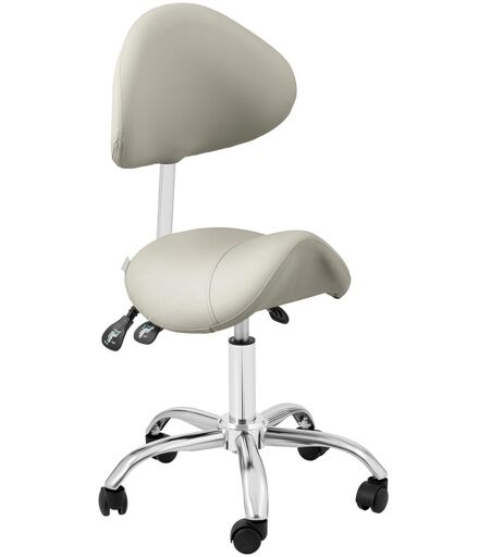 Denne komfortable sadelstolen med ryggstøtte fra physa har et sete formet som en sal, som navnet tilsier. Utstyrt med jevnt rullende svingbare hjul og flere justeringsmuligheter, passer denne stolen rett inn i enhver skjønnhets- eller frisørsalong, spesielt når arbeidet krever justerbar høyde og stigning, komfort og stabilitet. Den gir også høy mobilitet på trange steder, er laget etter høye produksjonsstandarder og har en bæreevne på opptil 150 kg. Denne sadelstolen er spesielt uvurderlig fordi den kan brukes i så mange omgivelser, inkludert i tatoveringssalonger, spa, velværestudioer, hjemme eller på kontoret. Leter du etter maksimal komfort som er lett på ryggen? Da er denne setestolen det perfekte valget for deg: Ryggstøtten kan vippes med 0 - 22° via en spak. Ryggstøtten kan justeres i høyden fra 89 - 103 cm takket være en annen brukervennlig spak. Den 5 cm tykke Skum seteputen er dekket med PVC-skinn og tilbyr ekstra komfort, det samme gjør det polstrede armlenet. Arbeidskrakken har en korsformet base med 5 glattrullende, 360°-svingbare hjul som gjør det mye lettere å skyve eller trekke stolen, enten det er i kommersielle eller private rom. Samtidig gir den korsformede basen stabilitet. Hele setestolen kan også roteres 360 grader, noe som er spesielt nyttig når du skal utføre arbeid som krever mobilitet. I tillegg kan setet til sadelkrakken enkelt og raskt justeres i høyden fra 51 - 65 cm. For å justere setehøyden, trykk ganske enkelt spaken under setet i den respektive retningen og setet beveger seg jevnt opp eller ned takket være den effektive Gassfjær-mekanismen. Den robuste rullekrakken med ryggstøtte tåler en maksimal vekt på 150 kg. PVC-skinn-trekket er veldig enkelt å rengjøre, da det avviser væsker og støv. Materialer av høy kvalitet sikrer robust konstruksjon. Blandingen av forkrommet stål og det elegante dekselet sørger også for et stilig og tiltalende utseende. ...