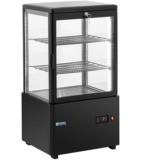 Enten det er kaker, desserter, salatskåler, frukt, smørbrød eller kalde drikker: med RCCC-58-BT kjølemonter fra Royal Catering, ekspertene for høykvalitets cateringutstyr, blir alt presentert på en appetittvekkende måte. Sett opp den innbydende kjølevitrinen i nærheten av disken i kafeen, bistroen eller buffeen på hotellet, slik at gjestene kan se hva som tilbys. De tre nivåene gir god plass til kaker, smørbrød, fruktsalat eller karafler med milkshakes eller smoothies. De to hyllene har mål på 38,5 x 32,5 cm og tilbyr et sjenerøst presentasjonsareal. Disse hyllene deler optimalt opp 58 L innvendig plass i kjøledisken. Den integrerte LED-belysningen kaster riktig lyst på maten, slik at gjestene kan se hvilke delikatesser som tilbys selv i mørkere omgivelser. Døren til kjølevitrinen kan låses. Den digitalt justerbare termostaten regulerer temperaturområdet fra 0 - 12 °C og sørger for en optimal temperaturkontroll for det meste av mat og drikke. Den romslige kjøledisken er stabil og står på fire gummiføtter som beskytter gulvet mot riper. Materialer som rustfritt stål og herdet glass er lett å rengjøre og er derfor hygieniske, noe som er viktig i storkjøkkenbransjen. ...