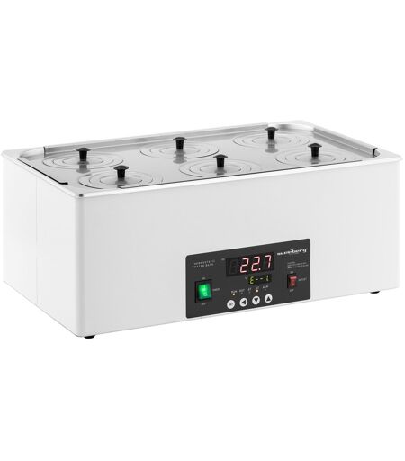 Nøyaktig temperert og enkel å betjene: Med dette digitale vannbadet kan du forsiktig varme opp prøver av alle slag. Enten i utdanningsinstitusjoner, laboratorier eller i det medisinske miljøet - med Steinberg Systems sikrer du høykvalitets basisutstyr i laboratoriet. Vannbadet for laboratorier og forskningsanlegg varmer opp prøvene som brukes jevnt og jevnt. Bruk den nøyaktige termostaten til å stille inn ønsket temperaturområde på5 - 100 °C. Den optimale temperaturfordelingen av vannbadet unngår en plutselig endring fra kaldt til varmt. Det flate lokket med ringelementer lar deg justere diameteren på de 6 åpningene etter ønske. Velg mellom 50 mm, 80 mm og 110 mm. Laboratorievannbadet har et kontrollpanel med LED-display som tydelig viser de innstilte parameterne. Den intuitive håndteringen gjør det enkelt for deg å jobbe med prøver av alle slag. Brettet måler 450 x 250 x 50 mm. Hvis det er for lite væske i kummen eller hvis det truer med overoppheting, slår enheten seg av automatisk. De1620 W laboratorievannbad er laget av robust rustfritt stål. Komponentene er enkle å rengjøre og vedlikeholde. ...