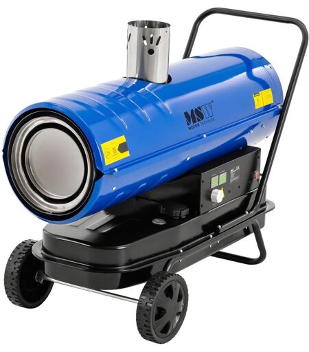 Enten det er et lager eller et telt, med dieselvarmekanonen fra MSW kan du raskt og effektivt varme store rom til en behagelig temperatur. Oppvarmingsmidlet er diesel, som holdes i 38 l-tanken. Plasser oljefyren på plass på den praktiske vognen og sørg for en optimal arbeidstemperatur på byggeplassen, i ditt lager eller verksted. Takket være en varmeeffekt på 30000 W og en utgangstemperatur på 450 °C, kan du raskt bringe miljøet til ønsket temperatur, som du styrer ved hjelp av et LED-display. En termostat kontrollerer utetemperaturen og varmer opp når temperaturen faller under innstilt verdi. Ved full effekt produserer dieselvarmeren 1560 m³/t varmluft, som viften fordeler jevnt i rommet. Disse ytelsesverdiene garanterer deg komfortable arbeidstemperaturer i rom med opptil 185 m². For din sikkerhet er oljevarmeren laget av motstandsdyktig stålplate utstyrt med flere sikkerhetsfunksjoner. En detektor oppdager ukontrollerte flammer og slår automatisk av apparatet. I tillegg har den en overopphetingsbeskyttelse som garanterer deg sikker kontinuerlig drift. På denne måten kan du alltid tilby en pålitelig varmekilde for forskjellige rom. Med en dieseldrevet varmepistol, sørg for at rommene alltid er godt ventilert. ...