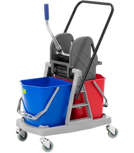 Rengjøringsvognen med to bøtter og en presse fra ulsonix sine industrielle forsyninger forenkler grundig rengjøring av store områder eller mange rom. En stor fordel på skoler, restauranter, barer, hoteller, kontorer og alle steder som krever regelmessig gulvvedlikehold. Veddelvognen tilbyr et praktisk to-bøttesystem med en kapasitet på 2 x 17 l som rent skiller ferskt og brukt rensevann. De forskjellige fargene på bøttene forenkler skillet. Denne doble løsningen sikrer at gulvflater alltid rengjøres med ferskvann og at gulvvedlikeholdet er mye mer hygienisk. Hvis vannet må fornyes, gjør den avtakbare pressen og bøtta med håndtak det enklere å bruke. Med sin ekstremt stabile press sørger rengjøringsvognen for jevnt trykk på moppehodet, som måler opp til 130 mm. Den ekstra høyt monterte spaken gir en ryggvennlig holdning under utpressing. Den industrielle rengjøringsvognen er imponerende med sin langvarige kvalitet. Både bøtter og presser er laget av lettstelt plast, noe som gjør dem til det ideelle materialet for håndtering av vann og rengjøringsmidler. De fire 360° roterbare hjulene laget av slitesterk plast (PVC) garanterer rolige, jevne bevegelser på alle gulvflater. ...