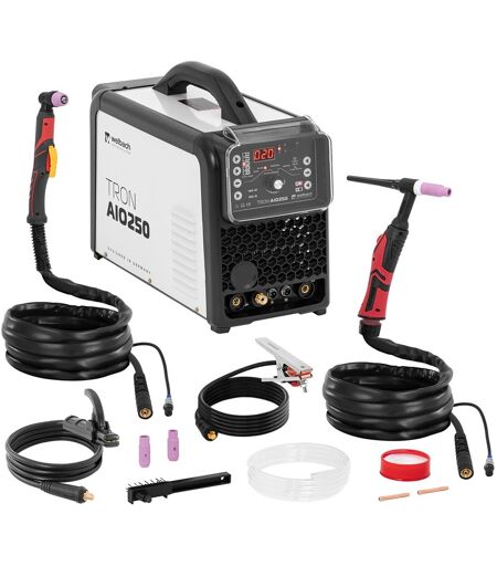 TRON AIO250-sveisemaskinen fra Welbach tilbyr en profesjonell, kraftig og høykvalitetsløsning for en rekke reparasjons- og vedlikeholdsjobber. Sveis nøyaktig med beskyttelsesgass ved bruk av sveiseprosessene TIG DC AC eller med elektroder i MMA-modus opp til 250 A med en driftssyklus på 60 %. Vil du kutte metaller? Bruk deretter den integrerte plasmakutteren på 50 A. Kjernen i denne enheten er toppmoderne IGBT-inverterteknologi, som muliggjør en rask overgang mellom TIG DC, TIG AC og manuell metallbuesveising (MMA), og implementerer pålitelig alle parametere. Bytte fra 2-syklus til 4-syklus modus gjør sveising enklere og mer praktisk. Juster enkelt og komfortabelt alle parametere – selv mens du bruker sveisehansker – og overvåk dem på LED-displayet og det tydelige kontrollpanelet. TIG-sveiseren lar deg sveise med enten like- eller vekselstrøm, avhengig av metallet. Du kan behandle lettmetaller som aluminium eller titan med vekselstrøm (AC). Bruk likestrøm (DC) for sveising av robuste metaller som stål, rustfritt stål, kobber eller messing. Ved behov, bruk pulsfunksjonen for perfekte sveiser. Velg en rekke parametere for pulsfunksjonen, som start-, basis- eller sluttstrøm, og juster dem optimalt til ditt arbeidsstykke ved hjelp av dreiekontrollen. Ved plasmaskjæring styrer du trykkluften ved hjelp av den eksterne trykkregulatoren og juster strømmen til maksimalt 50 A. Ønsker du å sveise utendørs, selv i sterk vind? Da er den manuelle metallbuesveisingsmetoden (MMA) det du er ute etter. Oppnå utmerkede sveiseresultater med stabil strømstyrke når du arbeider med metaller som stål, jern, støpejern, nikkel eller kobber. For din sikkerhet er flerprosesssveiseren beskyttet mot overoppheting. For din egen sikkerhet er kombisveiseren beskyttet mot overoppheting. IGBT-nverterteknologien muliggjør en kompakt design, som gjør det enkelt å transportere sveisemaskinen til arbeidsstedet via bærehåndtaket. ...