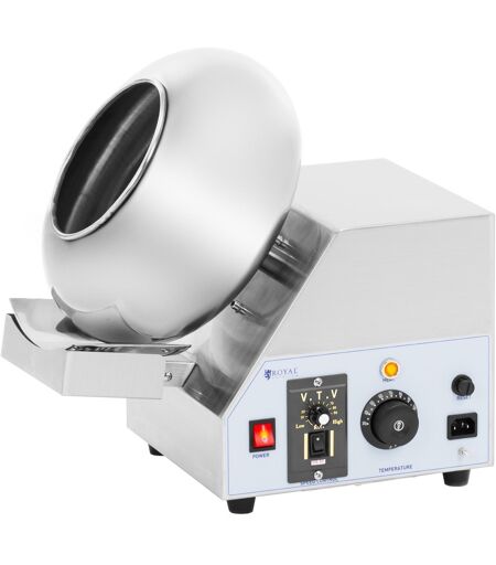 Forvandl frø, nøtter, mandler, sultanas eller kaffebønner profesjonelt til velsmakende søtsaker i Royal Caterings elektriske malingsmaskin. Med en kapasitet på opptil 2 kg kan du produsere store mengder sukkerbelagte mandler, fargerike sjokoladeknapper på kort tid. Takket være det brede utvalget av innstillinger kan du finne riktig rotasjonshastighet og den perfekte temperaturen for hver søt tann. Beleggpotten har en 600 W-motor, som muliggjør jevn belegging. Avhengig av ønsket spesialitet, velg ett av 10hastighetsnivåene og en temperatur mellom 30 - 110 °C. Innstillingen for dette gjøres intuitivt via de store dreiekontrollene på siden av huset. Laget for profesjonell produksjon av godteri, vannkokeren og huset er laget av høykvalitets rustfritt stål. Dette materialet er ideelt for bearbeiding av matvarer og er også spesielt motstandsdyktig og lett å rengjøre. Den galvaniserte stålbunnplaten garanterer et sikkert stativ og stabiliserer malingsmaskinen under drift. ...