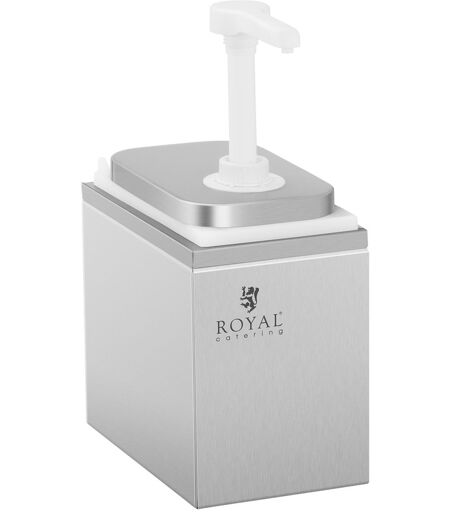 Sausdispenseren RCDI-2L fra Royal Catering er svært allsidig: Server soyasaus, eddik, ketchup og salatdressing eller andre tynne, homogene sauser porsjoneres raskt og rent. Den elegante dispenseren av rustfrit stål er ideell for selvbetjening i kantiner, store kjøkken, burger joints og pølseboder. Den holdbare sausdispenseren i det elegante huset i rustfritt stål ble spesielt utviklet for cateringindustrien. Enheten er robust, hygienisk og garanterer mange års bruk med dressing, saus og dip. For variasjon, har dispenseren to separate indre beholdere laget av hygienisk og langvarig polypropylen. Med et volum på 1 liter per beholder trengs den ikke å fylles opp så ofte. Dette gjør at dressingen holder seg fersk uten at du trenger å styre så mye med den. Dispenseren for dressing er perfekt for å porsjonere eksakte mengder med pumpen, som gjør at den er brukervennlig for selvbetjening. Kunder kan velge sin dressing-favoritt for chips eller pølser. Den glatte overflaten av rustfritt stål rengjøres med en våt klut. Siden overflaten er glatt og ikke porøs er det svært lett å rengjøre enheten. Denne ketchup-dispenseren forblir hygienisk selv etter å ha vært i bruk etter mange kunder. Beholderene for sausene kan fjernes og rengjøres når som helst. ...