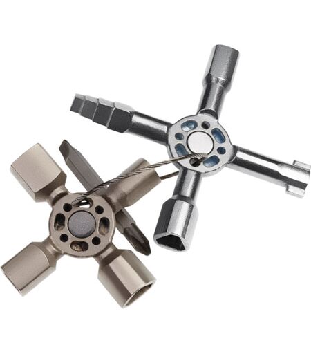 Multifunksjonell nøkkel for betjening av låsinger på områdene bygningsteknikk (varme og sanitær, klima- og ventilasjonteknikk, elektroteknikk) gass- og vannforsyning og sperresystemer 8-arm versjon: 2 kryssnøkler er plassparende forbundet med magneter Vendebit: Sliss 1,0 x 7 mm og kryssliss PH2 Nøkkel og vendebit forbundet med stabilt edelstål-wire Høyverdig overflatebelegg Vektoptimert sink-trykkstøp konstruksjon ...