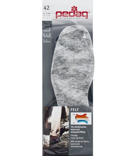 Felt vintersåle fra Pedag av slitesterk syntetisk filt. Sålen har anti skli forsterket underside. Sålen er svært fuktabsorberende og bidrar til ett godt klima i skoene uansett aktivitet. Vintersåle Slitesterk syntetisk filt Fuktabsorberende Passer til alle typer fottøy ...
