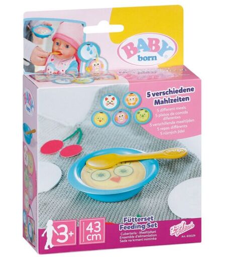 BABY born Feeding SetMmmmh, deilig! Fra nå av vil Baby Born menyen bli enda mer variert. Hell bare vann på tallerkenen og et bredt utvalg av måltider vises - alt med et vennlig ansikt - og når platen tørker, forsvinner retten igjen. Tid for mat! Tilbehør av høy kvalitet for utvidet, variert og ...