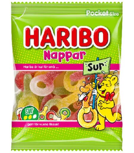 Pose med Haribo sure smokker vingummi på 80 gram. Perfekt som godtepose pinatafyll, lørdagsgodt, jentekveld, bursdag kveldskos og halloween.Se relaterte produkter for vårt utvalg av Malaco, Haribo & Ahlgrens Biler.Ingredienser: Glukosesirup ; sukker; gelatin; glukose; syrer: sitronsyre, eplesyre; surhetsregulatorer: kalsiumcitrat, natriumhydrogenmalat; frukt- og plantekonsentrater: spirulina, safflower, eple, sitron, reddik, søtpotet, gulrot, solbær, hibiskus; invertsukker; aroma; belegg: carnauba voks.Næringsinnhold Per 100 g:Energi 1463 (kJ)Energi 345 (kcal)Fett 0 g / hvorav mettede fettsyrer 0 gKarbohydrater 80 g Hvorav sokkerarter 49 g Protein 5.0 g Salt 0.01 g ...