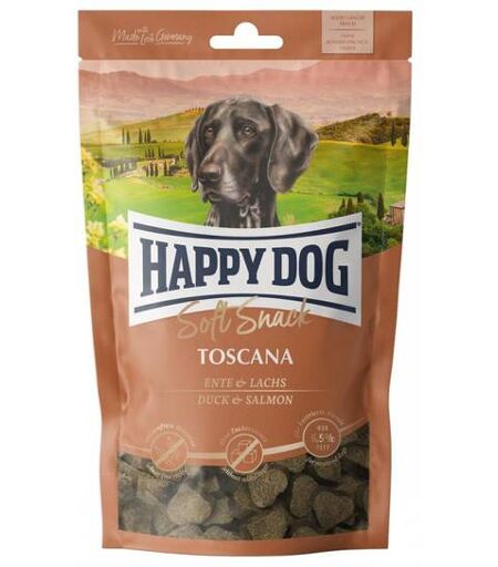 HAPPY DOG SOFT SNACK TOSCANA - AND & LAKS - 100g• And og laks• Glutenfri oppskrift• Redusert fettinnhold• Godt egnet til kastrerte hunderMyk, glutenfri godbit med deilig and og laks.De hjerteformede myke snacksene Toscana egner seg både til velvære og som en liten godbit innimellom. Lettfordøyelig and og fin laks raffinert med aromatiske middelhavsurter er en smaksopplevelse for kresne hunder. Den hvetefrie oppskriften med moderat fettinnhold er ideell for hunder av mellomstore og store raser som er kastrerte og krevende og som har en tendens til å bli overvektige. Disse snacksene er laget uten tilsatt sukker eller konserveringsmidler. Posene er gjenlukkbare, og holder snacks ferske lenger. ...