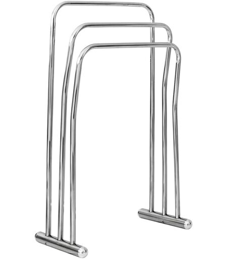 Håndklestativet Melbourne, med tre stenger i forskjellige høyder, er ideelt for å henge håndklær og klær. Forkrommet metall er holdbart og sikrer lang levetid selv i fuktige rom. Dette dekorative, praktiske håndklestativet gir hvert bad en stilig oppdatering. I tillegg, takket være den solide basen, er det frittstående stativet stabilt, men likevel enkelt å flytte. ...