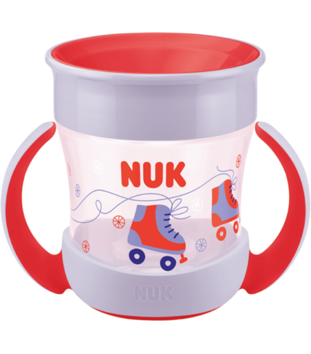 NUK Evolution Mini Magic Cup er en praktisk og sølefri drikkekopp som kan drikkes av fra alle sider. NUK Evolution Mini Magic Cup har et smart design som gjør at barnet kan drikke fra alle sider av koppen, som et vanlig glass, men uten søl. Drikkekoppen er utstyrt med ergonomiske håndtak som er designet for å passe barnets små hender. Den integrerte luftventilen gjør at barnet kan drikke uten pause. Det medfølger et beskyttelseslokk som kan benyttes når koppen ikke er i bruk. Koppen tåler oppvaskmaskin og er BPA-fri. Drikkekoppen rommer 160 ml, i fargen rød og lilla. Til barn fra ca. 6 måneder. ...