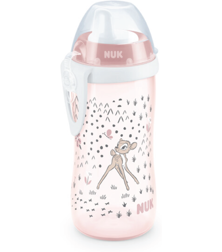 NUK Kiddy Cup Bambi er en praktisk drikkeflaske med sugerør for barn, med motiv av Bambi. NUK Kiddy Cup Bambi er sølefri og flasken er designet for å passe i hendene på små barn. Drikkeflasken har et ekstra slitesterkt drikkerør som er laget av polypropylen og er sterkt nok til å tåle at barnet tygger på det. Med beskyttelseshetter og klips som kan festes på sekk eller bag. Flasken rommer 300 ml. Kan brukes fra ca. 12 måneders alder. ...